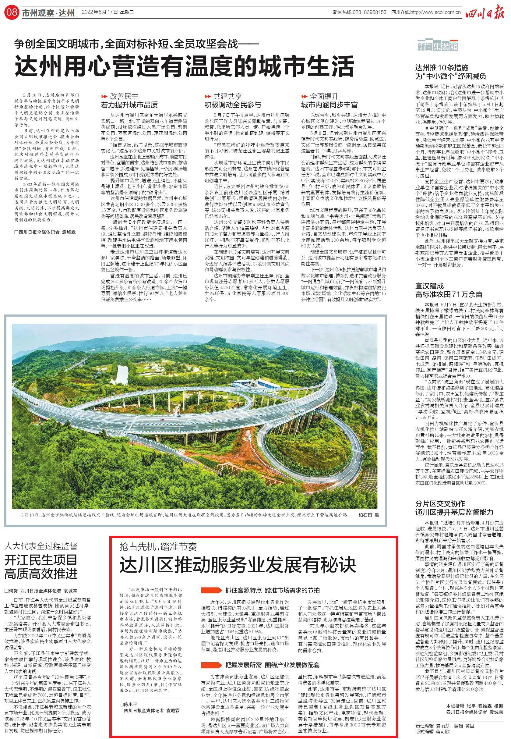 此前,达州市委、市政府明确了达川区“建设现代服务业集聚发展高地,打造城市型经济先导区”发展定位。目前,达川区政府已编制《省级服务业强区项目实施方案》,推动文化产业、电商物流、现代金融、美食项目等板块发展,制定《促进服务业发展十条措施》,每年拿出3000万元专项资金支持服务业。