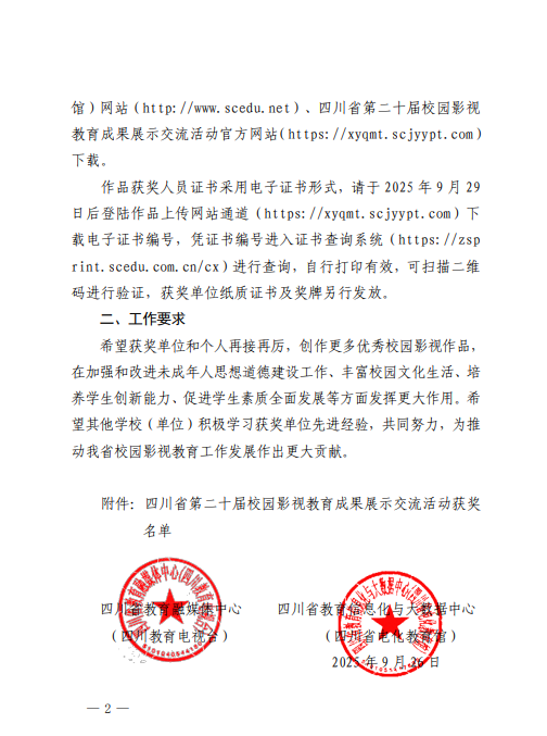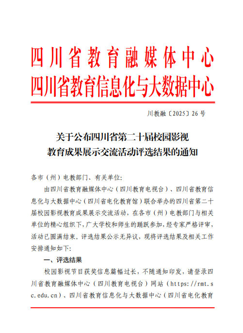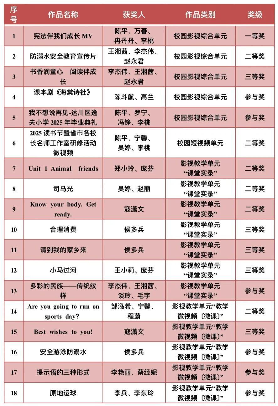 日前,由四川省电化教育馆、四川教育电视台联合主办的四川省第二十届校园影视教育成果展示交流活动获奖名单正式公示。作为全省校园影视教育领域的权威性赛事,本届活动吸引了来自全省各市(州)中小学、幼儿园报送的数千件影视作品参与角逐,经过专家评审团的严格初审、复审及终审,达川区逸夫小学报送的18部校园影视作品,在众多参赛作品中表现突出,最终全部获奖。