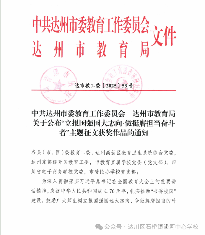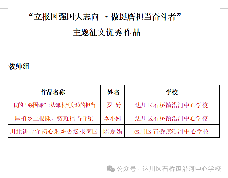 笔尖耕耘育桃李,硕果满枝传芬芳。在刚刚公布的《中共达州市委教育工作委员会达州市教育局关于公布“立报国强国大志向 ·做挺膺担当奋斗者”主题征文获奖作品的通知》(达市教工委〔2025〕53号)文件中,沿河学校罗婷、李小娅、陈夏娟三位老师的征文作品荣获市级荣誉。