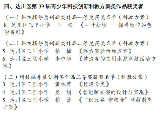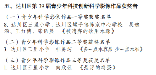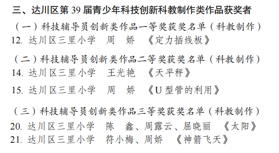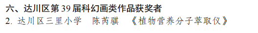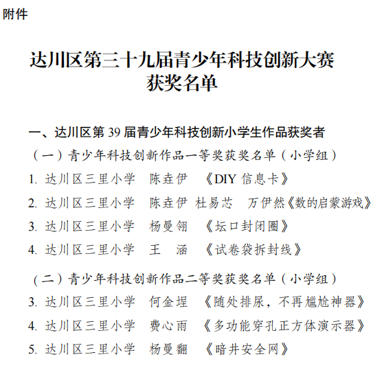 近日,第 39 届达川区青少年科技创新大赛圆满落幕。达川区三里小学师生怀揣对科学的赤诚之心,凭借扎实的科创能力与不懈努力,共获得一等奖 8 项、二等奖 8 项、三等奖 6 项,用 22 份荣誉为校园添彩,谱写校园科创辉煌新篇章!