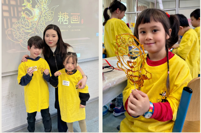 王莉老师的糖画课总是很受欢迎。在她手中,流淌的糖浆不仅是素材,更成为讲述中国故事的独特语言——它从液态到固态的凝结,恰似文化在传承中扎根的过程。运腕勾勒间,她为每个图案赋予深意:龙腾四海显智慧,喜鹊登梅寓吉祥,十二生肖蕴和谐。孩子们品尝的不仅是甜味,更是读懂了中国文化的美好寓意。