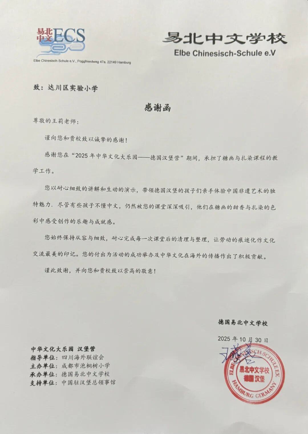 从德国远道而来的一封感谢信,更是为这次文化交流写下了温暖的续章。德国易北中文学校对王莉老师在“中华文化大乐园——德国汉堡营”中的教学给予了高度评价,特别赞扬她课上课后的专业风范与敬业精神——从倾囊相授到细致整理,于细节处展现中国教师优秀品质。这封跨国感谢信,既是一份温暖认可,更见证了一位教师以匠心热忱,成为中华文化的出色讲述者。
