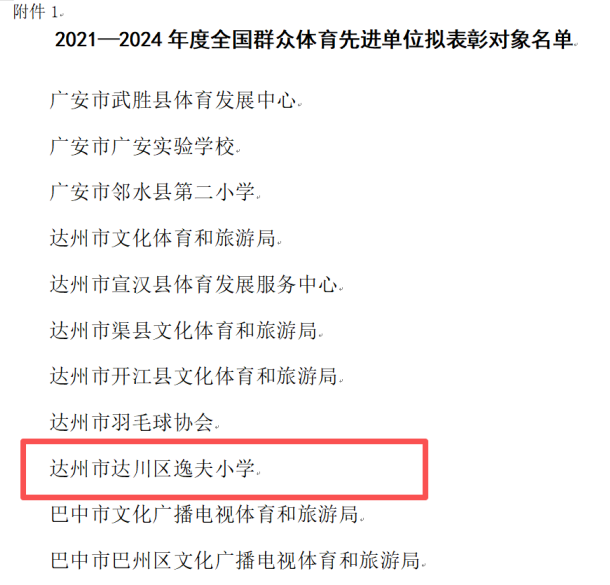 捷报传来,载誉前行!近日,国家体育总局发布《体育总局关于表彰2021-2024年度全国群众体育先进单位和先进个人的决定》,达川区逸夫小学荣获“全国群众体育先进单位”称号,是全市教育系统唯一一所受表彰的学校。