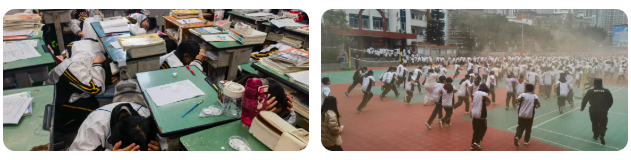 10:45,演练进入第二环节——火灾疏散。警报再次响起,模拟地震引发教学楼火灾情景。各班学生在班主任和任课教师的指挥下,按照预定路线,分列纵队、用衣袖、纸巾代替湿毛巾捂住口鼻,弯腰快速撤离。楼梯口、通道处均有安全岗教师引导,确保疏散过程安全有序。全体师生全部安全抵达操场指定区域集合。