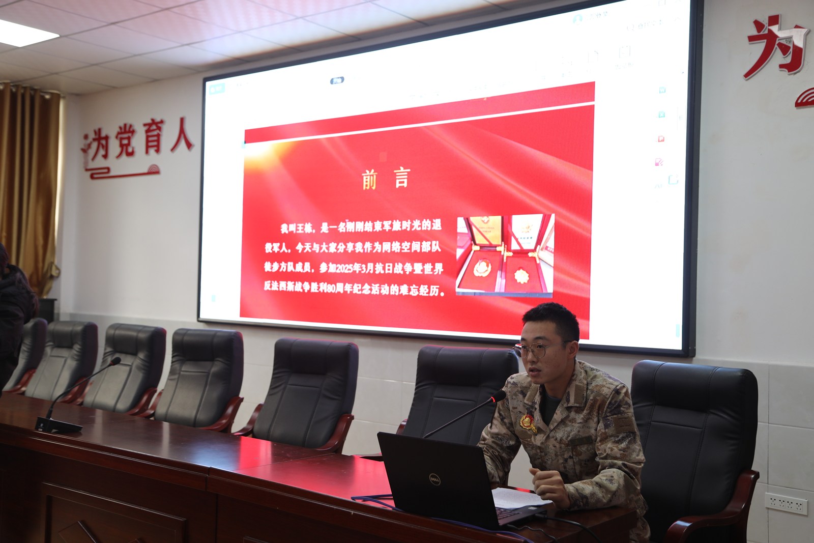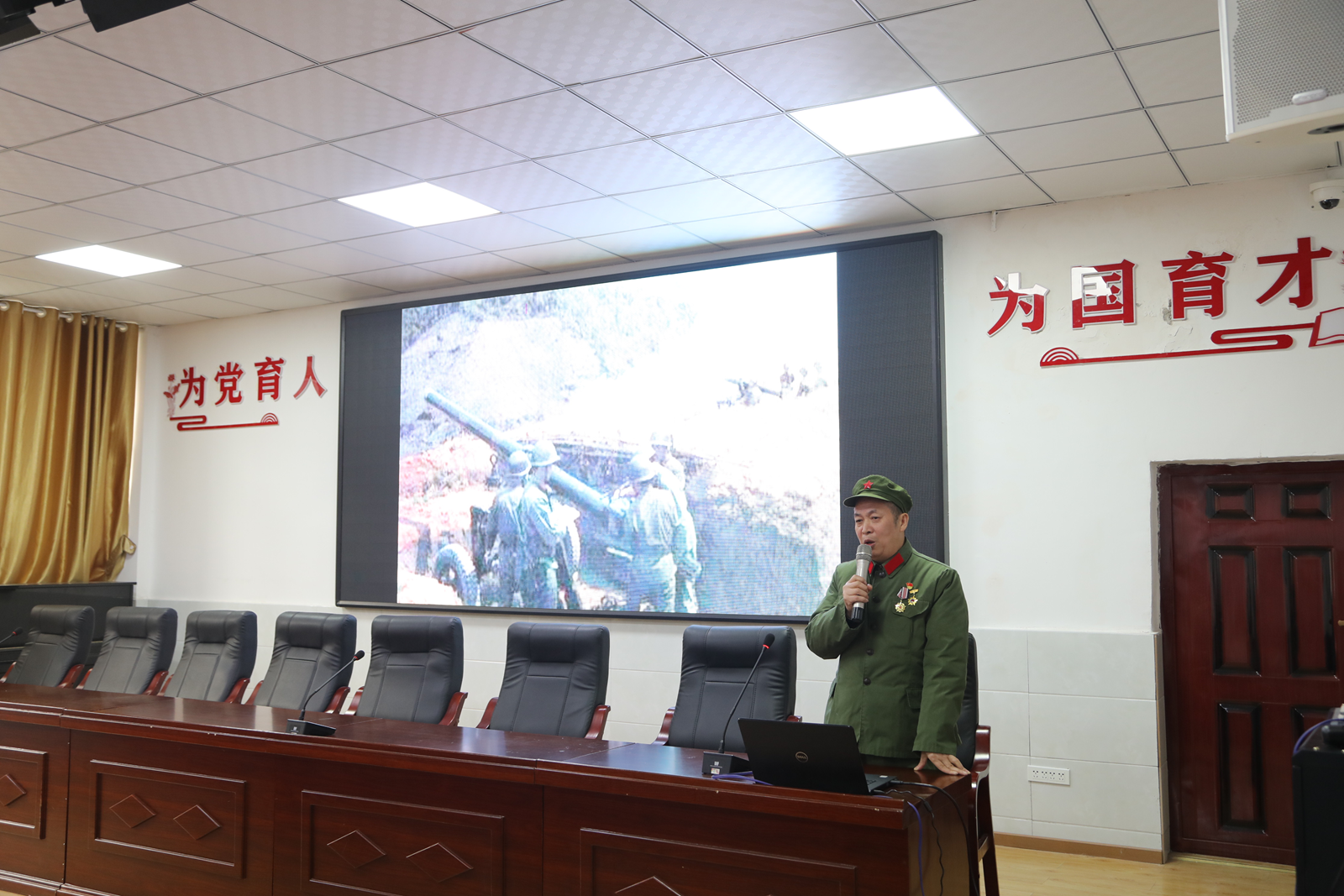 活动现场,三位优秀退役军人宣讲员轮番登场,用亲身经历传递红色力量。首位开讲的是参战老兵蒋建华,他1984年10月至1989年4月参加对越老山作战,服役期间荣立三等战功,现任达川区三里坪街道四合社区城南世家党支部书记。他结合枪林弹雨的战场经历,讲述了烽火岁月中军人的热血与担当,从阵地坚守到生死驰援,一个个真实片段让同学们深切感受革命先辈为守护家国所付出的牺牲与奉献,仿佛穿越时空触摸到了那段峥嵘岁月的温度。