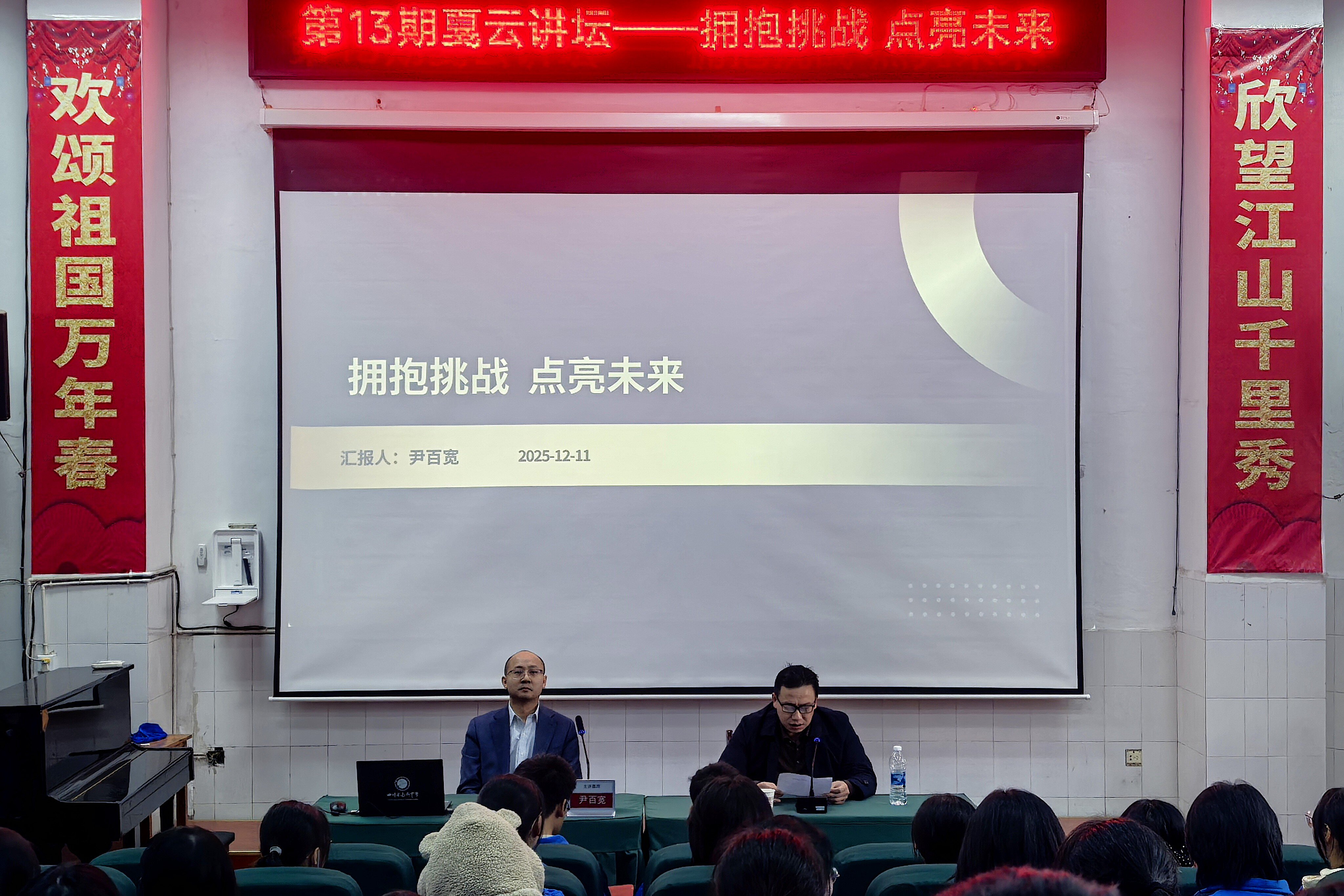 冬日暖阳映校园,薪火相传启新程。近日,四川省达州中学第13期戛云讲坛《拥抱挑战,点亮未来》主题讲座圆满举行。高2000届优秀校友、国金证券保荐代表人、投资银行北京大区总经理尹百宽重返母校,以近二十年的行业深耕经验与人生感悟为师生们带来了一场干货满满的思想盛宴。讲座由达州中学副校长潘光东主持。