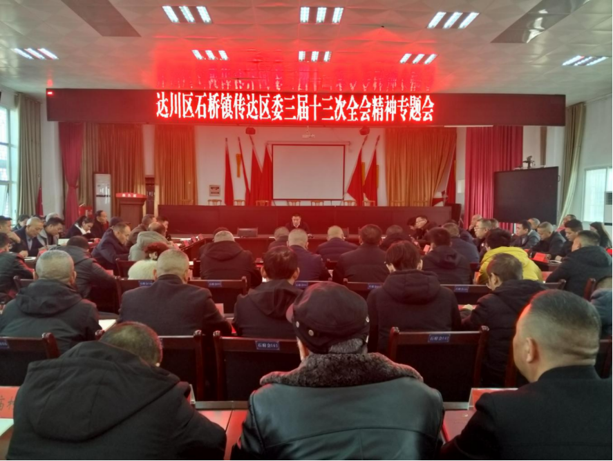 12月16日,石桥镇召开全体干部职工大会,集中传达学习中共达州市达川区委三届十三次全会精神,研究部署贯彻落实意见。