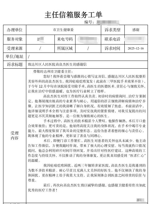 “高医生不仅医术精湛,更让我感受到了家人般的温暖。”近日,达川区卫生健康局收到一封市卫健委主任信箱转来的特殊工单——患者聂女士发来的感谢信,信中真挚赞扬了达川区人民医院整形美容外科高良杰医生。这封感谢信,是我区持续深化医德医风建设、提升医疗服务温度的生动写照。