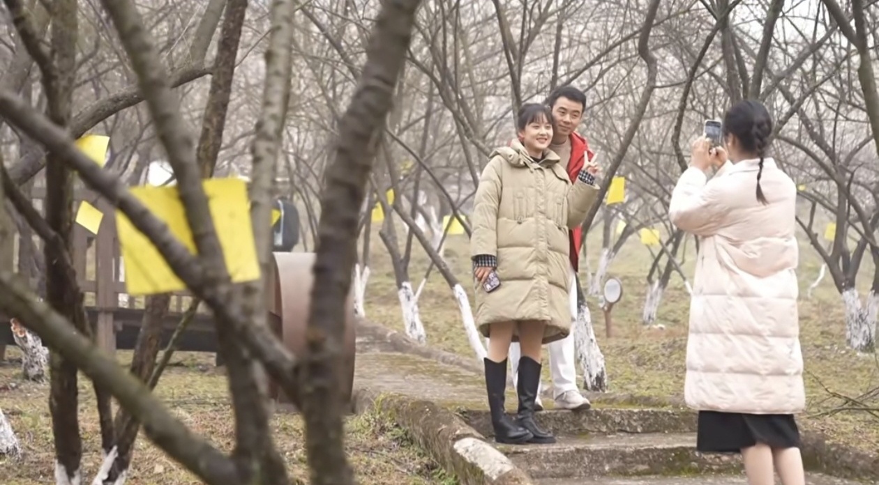 游客 谭山杉:我们一下车就被这里的景色惊艳到了,这里的青梅花粉扑扑的,一团一团的,非常的具有诗意,我们一进到这里面,闻着青梅花的淡香,让我们忘记了很多的烦恼,真的很治愈。