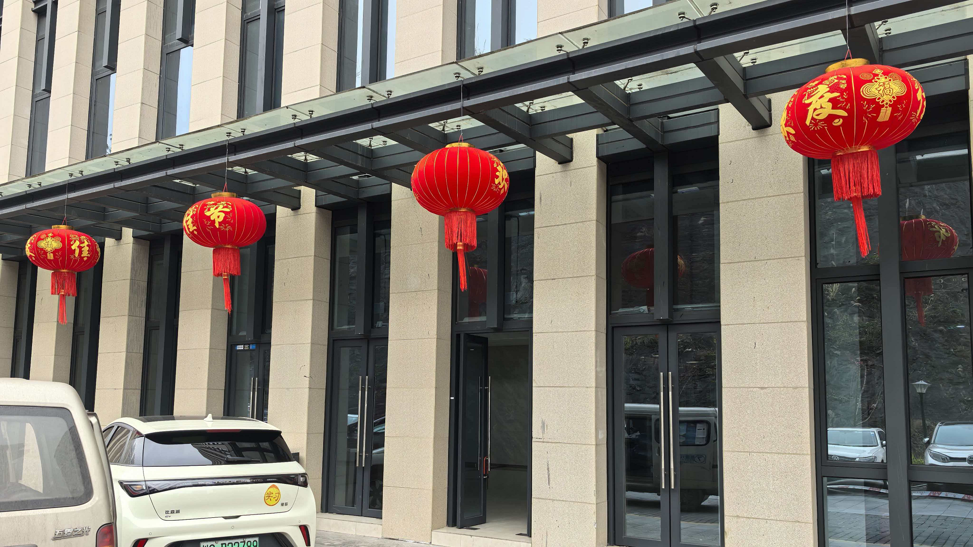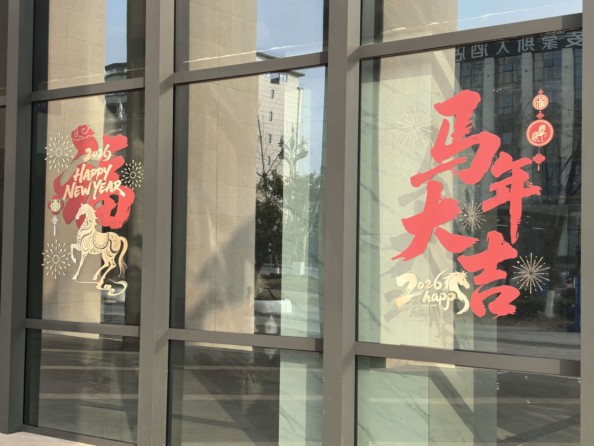 大厅两侧的玻璃窗上,错落有致地张贴着以生肖马为主题的手工窗花,奔腾的骏马图案栩栩如生,搭配着“福”字、如意等传统吉祥纹样,为原本严肃的办公环境增添了灵动的年味。