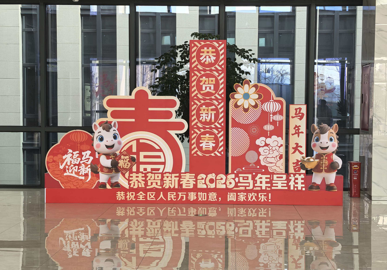 大厅中央,一组精心设计的新春立体立牌更是成为了“打卡焦点”。立牌以传统中国红为主色调,搭配金色线条勾勒轮廓,整体造型层次分明、年味十足。立牌底座上,“恭贺新春2026·马年呈祥”“恭祝全区人民万事如意,阖家欢乐”的祝福语温暖人心,不少群众路过时都会停下脚步,记录这份新春的喜悦。