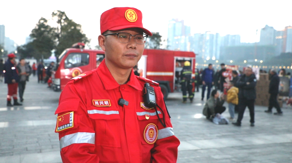 我们今天主要是负责现场安保,然后5个点位,今天晚上我们队出动16辆车,一台冲锋舟,然后水上救援有6人。剩下的5个点位安排了队员进行巡查,保证今天晚上的晚会能顺利圆满完成,保证观众安全。
