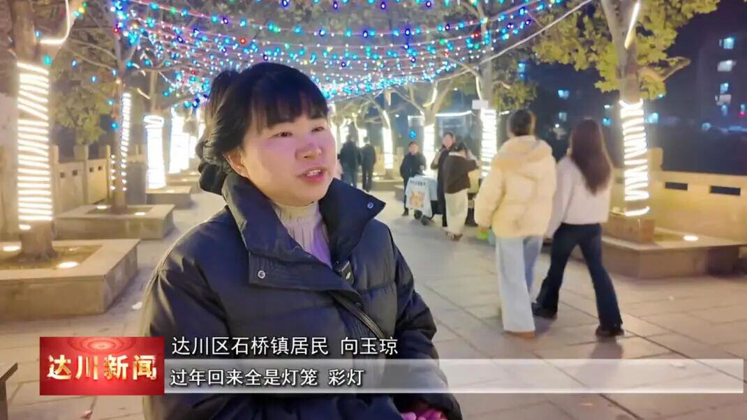 达川区石桥镇居民 向玉琼:过年回来全是灯笼、彩灯,景观大道也是灯火通明,门上全都贴了春联,感觉过年那种氛围很好。