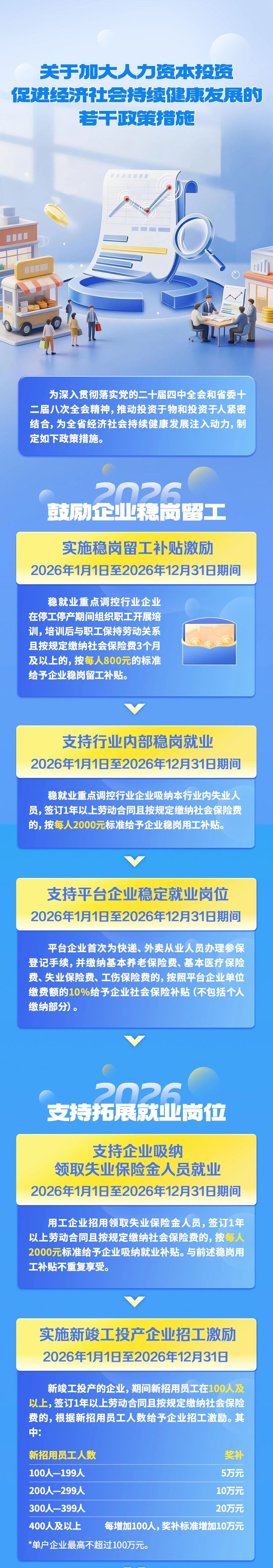 支持力度更大。20条措施绝大部分都是新政策,而且真金白银给支持。例如,在稳岗补贴方面,《政策措施》提出,2026年期间对稳就业重点调控行业企业在停工停产期间开展职工培训,并稳定岗位3个月及以上的企业,按每人800元的标准给予企业稳岗留工补贴。