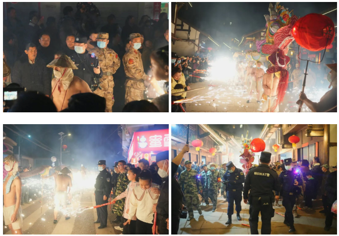 铁花映警徽,守护伴龙腾。火龙奔腾处,警灯常相伴;烟花绽放时,藏蓝在身旁。执勤警力穿梭在人群之中,巡逻防控、扶老携幼、答疑指路,用脚步丈量平安,用坚守温暖佳节,成为古镇元宵夜里最安心的风“警”。