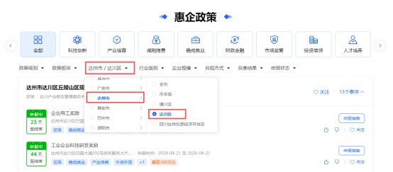 2、方式一:选择达州市/达川区,查看达川区惠企政策及惠企事项。