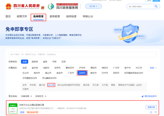 方式二:①点击免申即享,选择达州市/达川区,查看达川区免申即享类惠企事项。