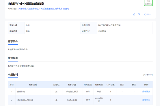 例:辖区内新开办的企业无需申请,凭营业执照及法定代表人身份证即可领取首套印章。