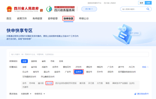 ②点击快申快享,选择达州市/达川区,查看达川区快申快享类惠企事项。