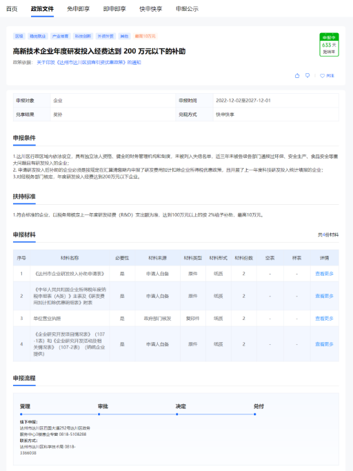 例:辖区内符合标准的年度研发投入经费达到200万元以下的高新技术企业,可携申报材料到线下惠企专窗或达州市达川区科学技术局办理。