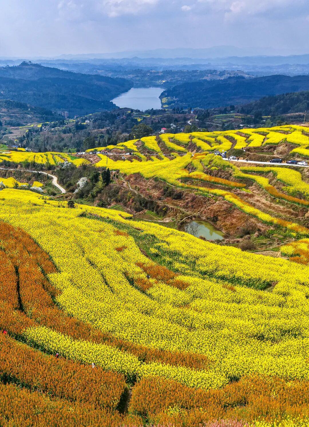相比其他地方动辄成千上万亩,该片油菜花面积并不大,就300多亩;也不像其他地方平平展展一望无垠,就铺陈在一片U形梯田里,沿巴河而上,层层叠叠,别有风味。特别是,镶嵌在花海里的10多亩彩色油菜花,就像在金黄的画布上打翻了调色盘,尤其让人流连忘返,拍得停不下来。