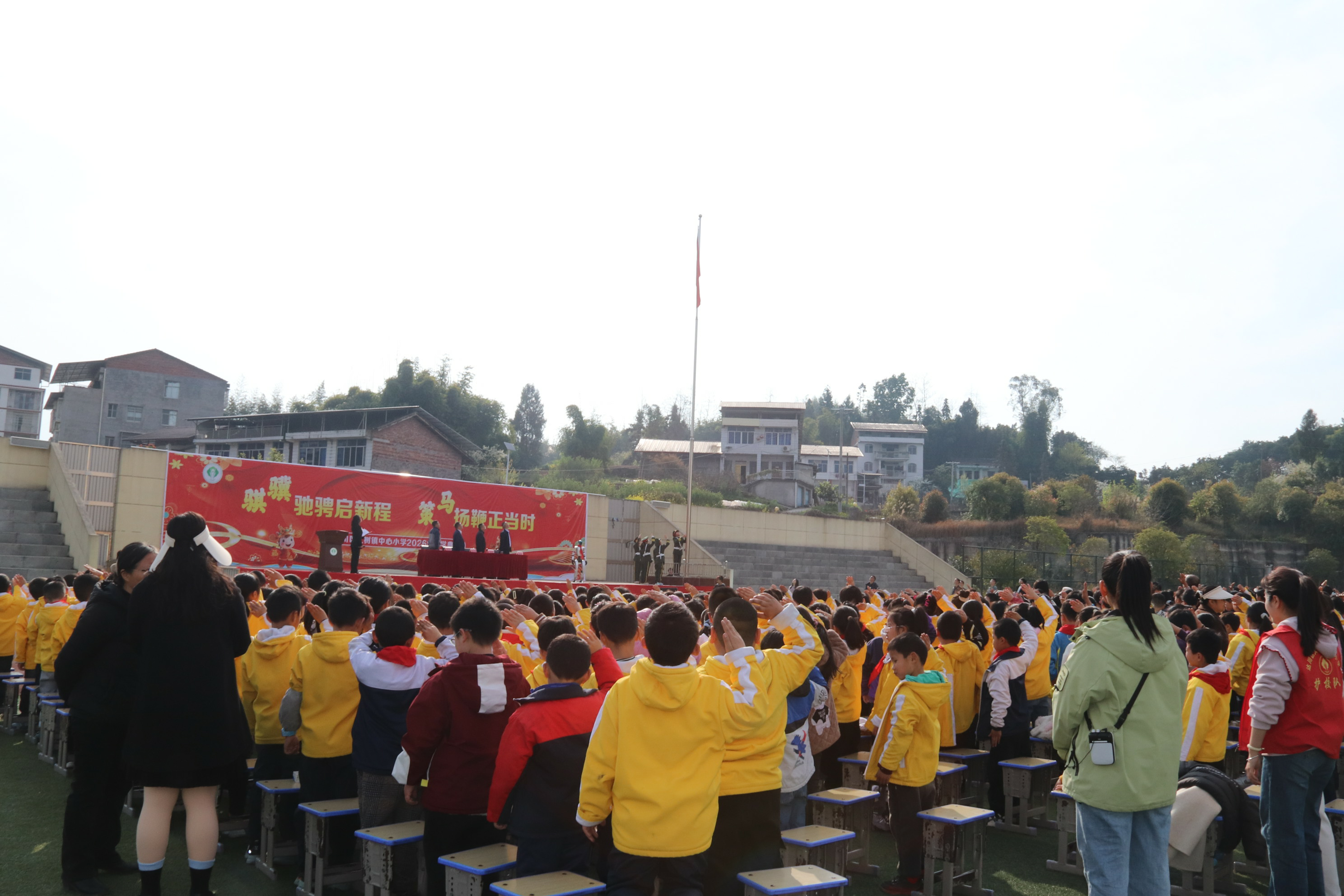 全体师生肃立,在嘹亮的国歌声中,五星红旗冉冉升起。目光所及皆是信仰,歌声所至皆是力量,我们以最庄重的姿态,开启新学期的奋斗征程。