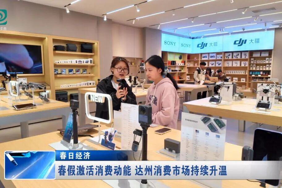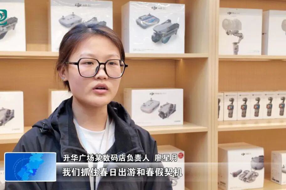 升华广场某数码店负责人 廖星月:我们抓住春日出游和春假契机,门店专门给到店购买产品的顾客准备好了礼品,不管是春日花海,还是亲子出游,都能满足大家的需求.现在每天咨询的顾客还是比较多。