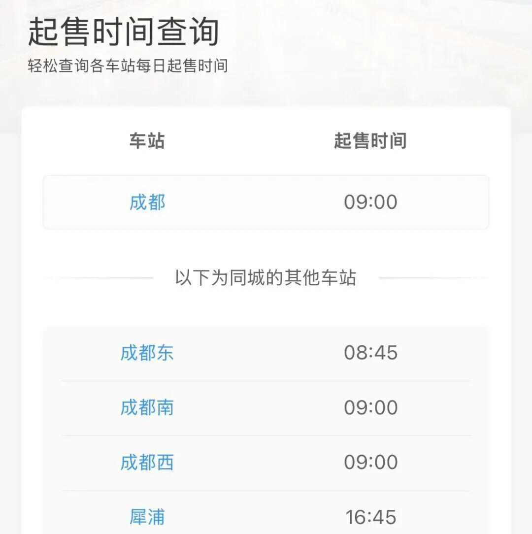 各大高铁站/火车站起售时间