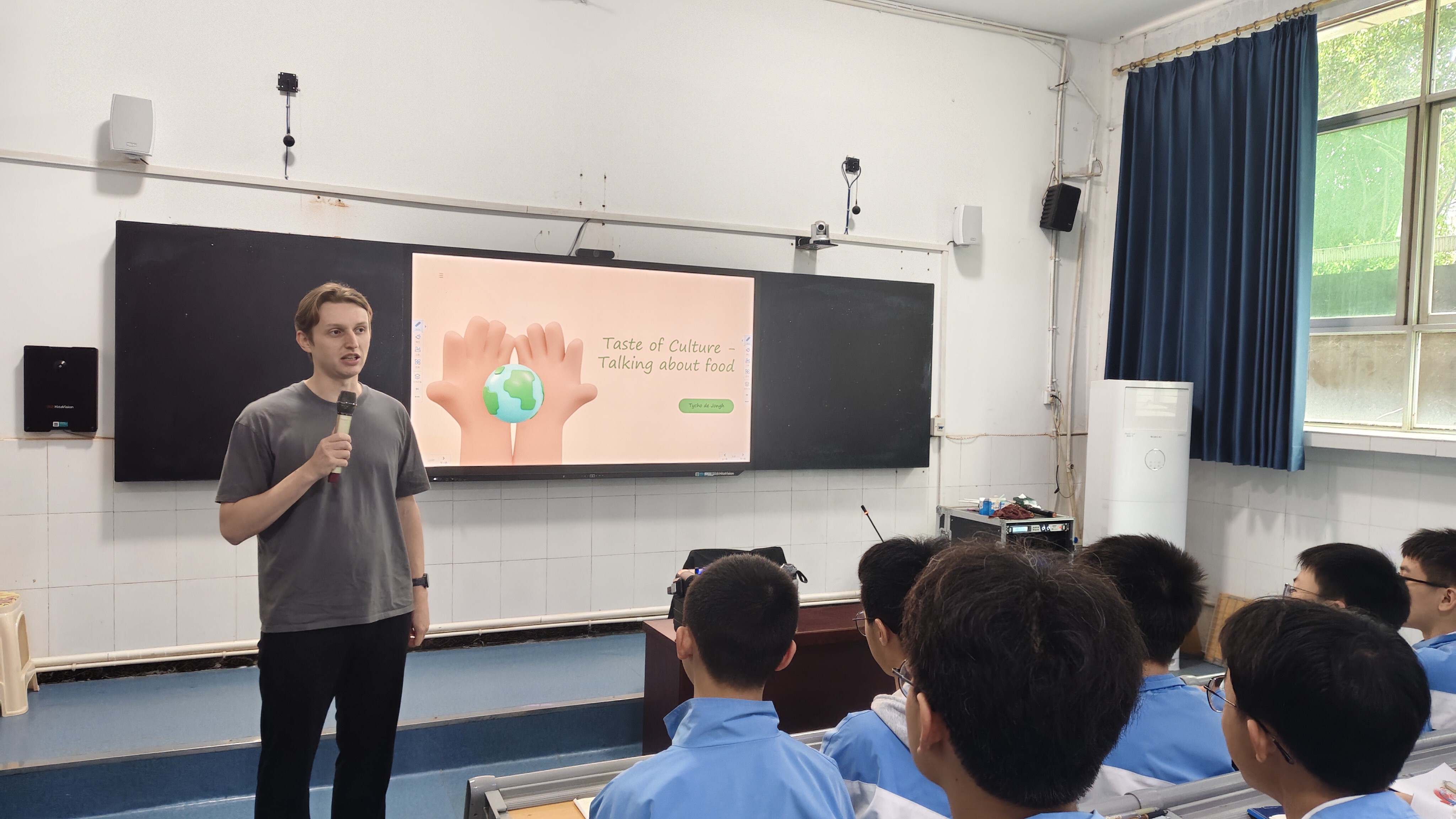 初中场讲座由外籍教师Tycho主讲,主题为“StinkyTofu,BlueCheese&Beyond:ATasteofCulturalMix(臭豆腐、蓝纹奶酪及其他:品味文化交融)”。Tycho老师以亲切自然的风格,从家乡特色文化与传统美食切入,分享中外特色饮食,通过臭豆腐与蓝纹奶酪等中西相似风味食物的趣味对比,生动展现饮食文化的碰撞与融合,让学生在轻松氛围中感受多元文化魅力。