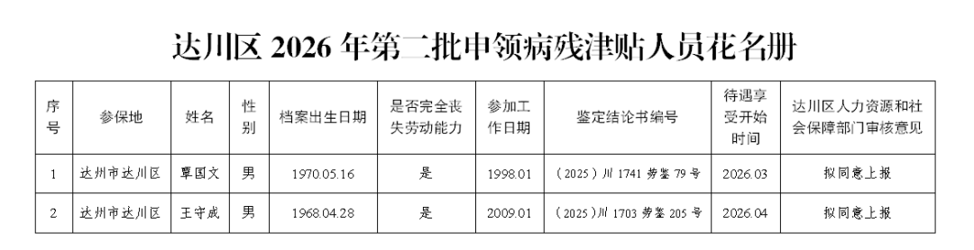 按照国家和省关于领取病残津贴待遇有关政策规定,经初审,覃国文等2名企业职工养老保险参保人员符合申报病残津贴条件,现予以公示。