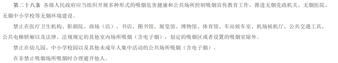 新修订的《四川省烟草专卖管理条例》第四条显示:全社会应当加强吸烟危害健康的宣传教育。禁止或者限制在公共交通工具和公共场所吸烟,禁止中小学生吸烟。