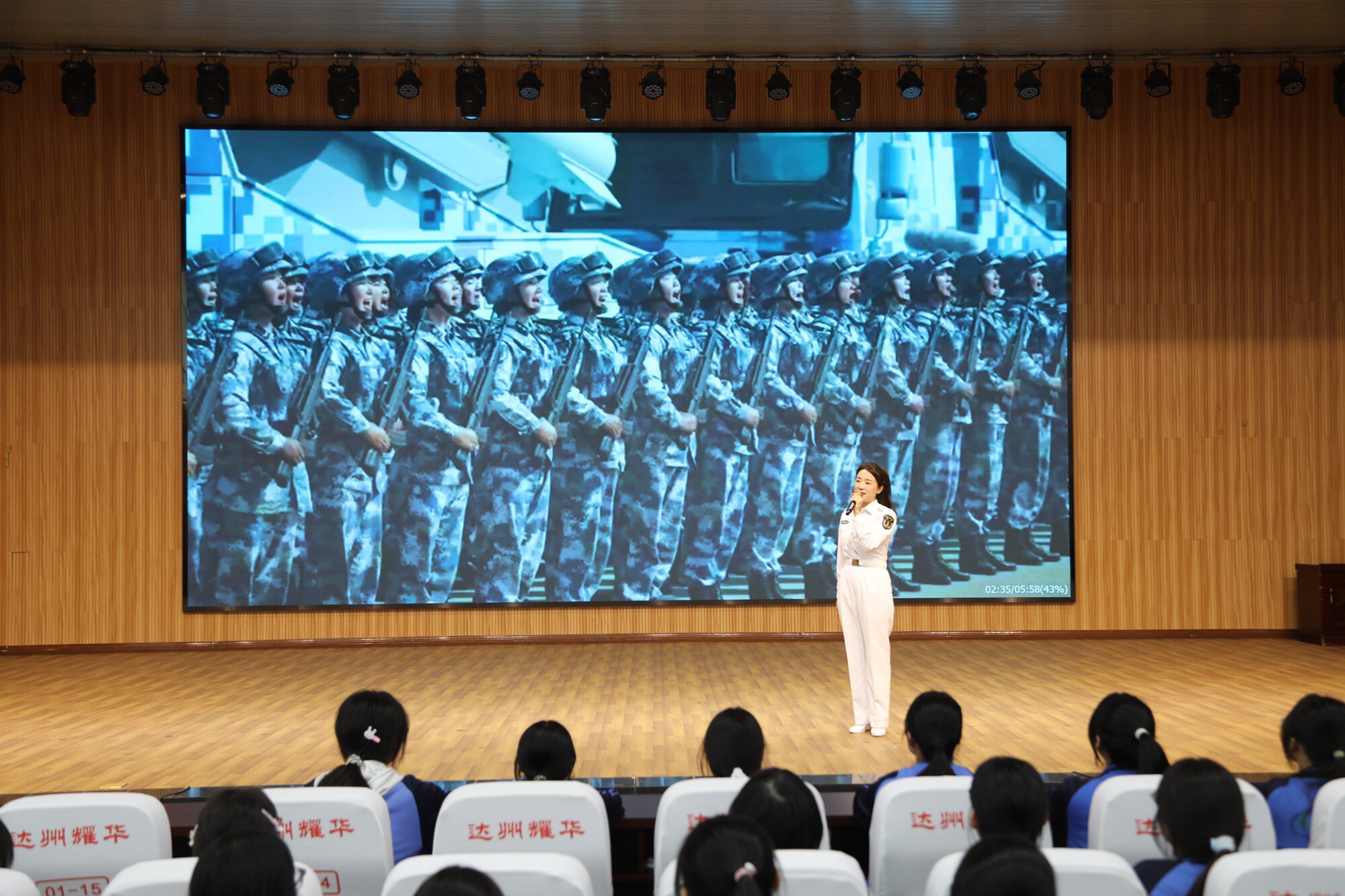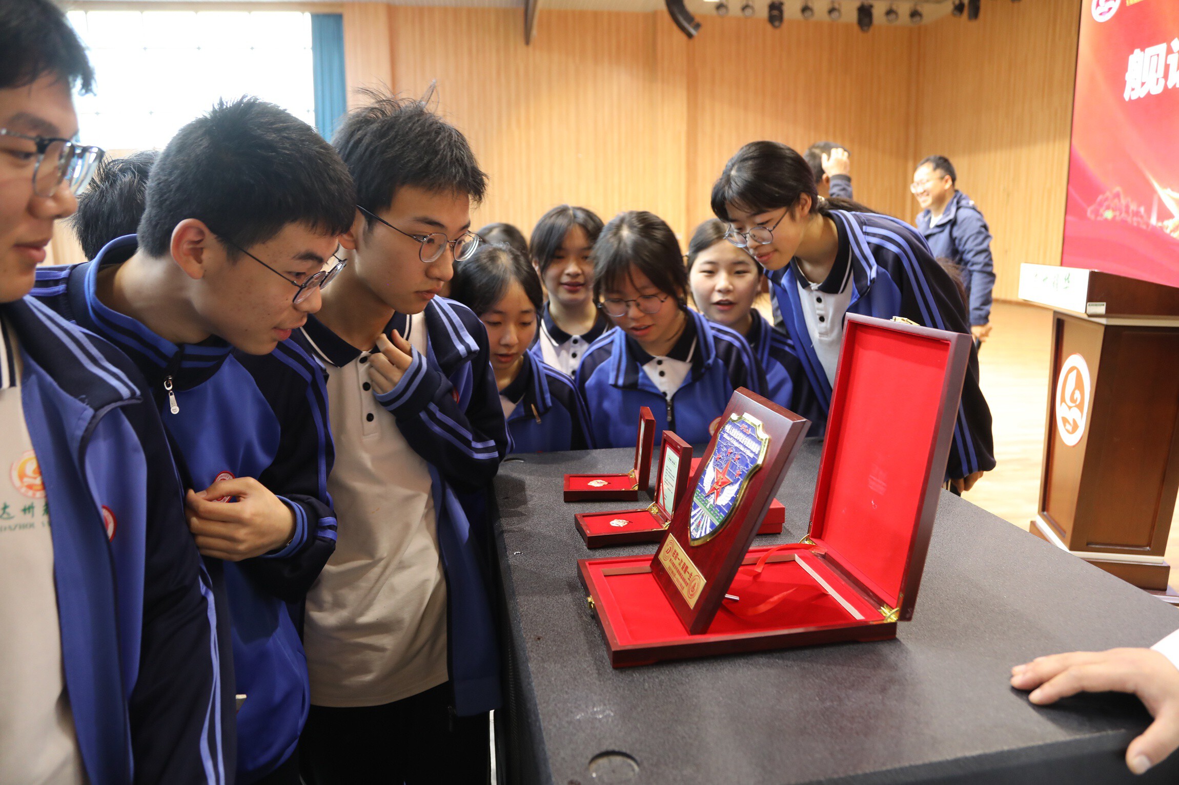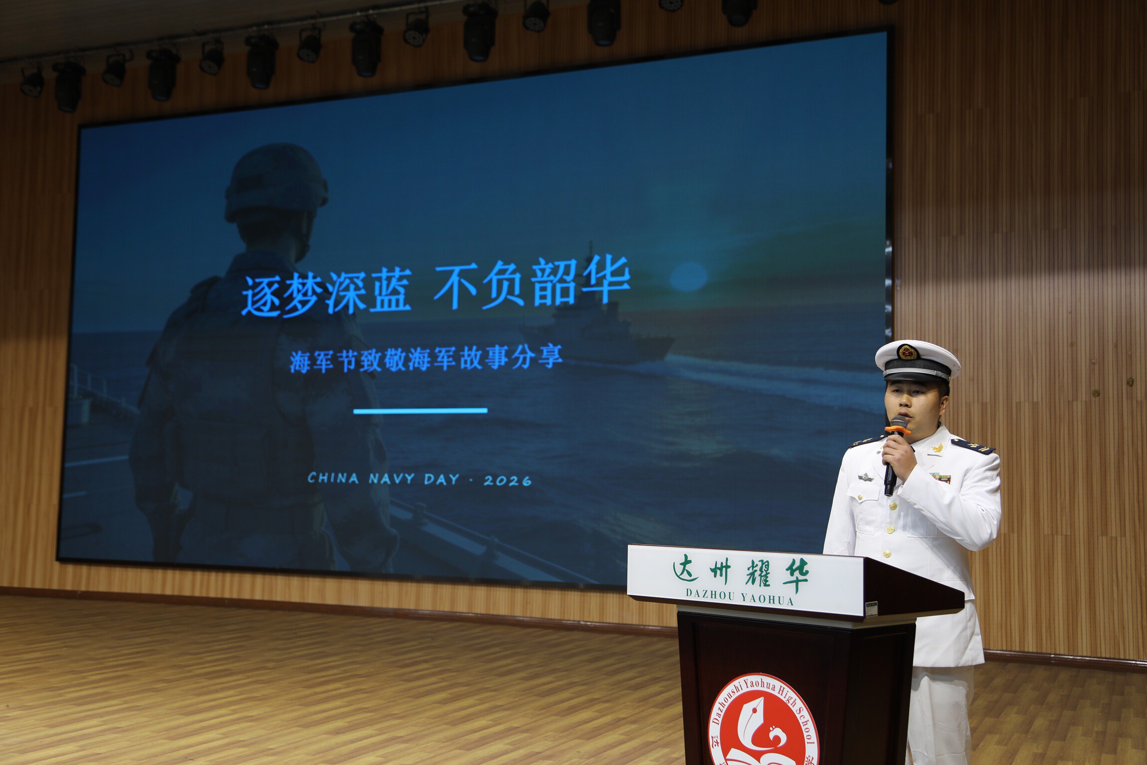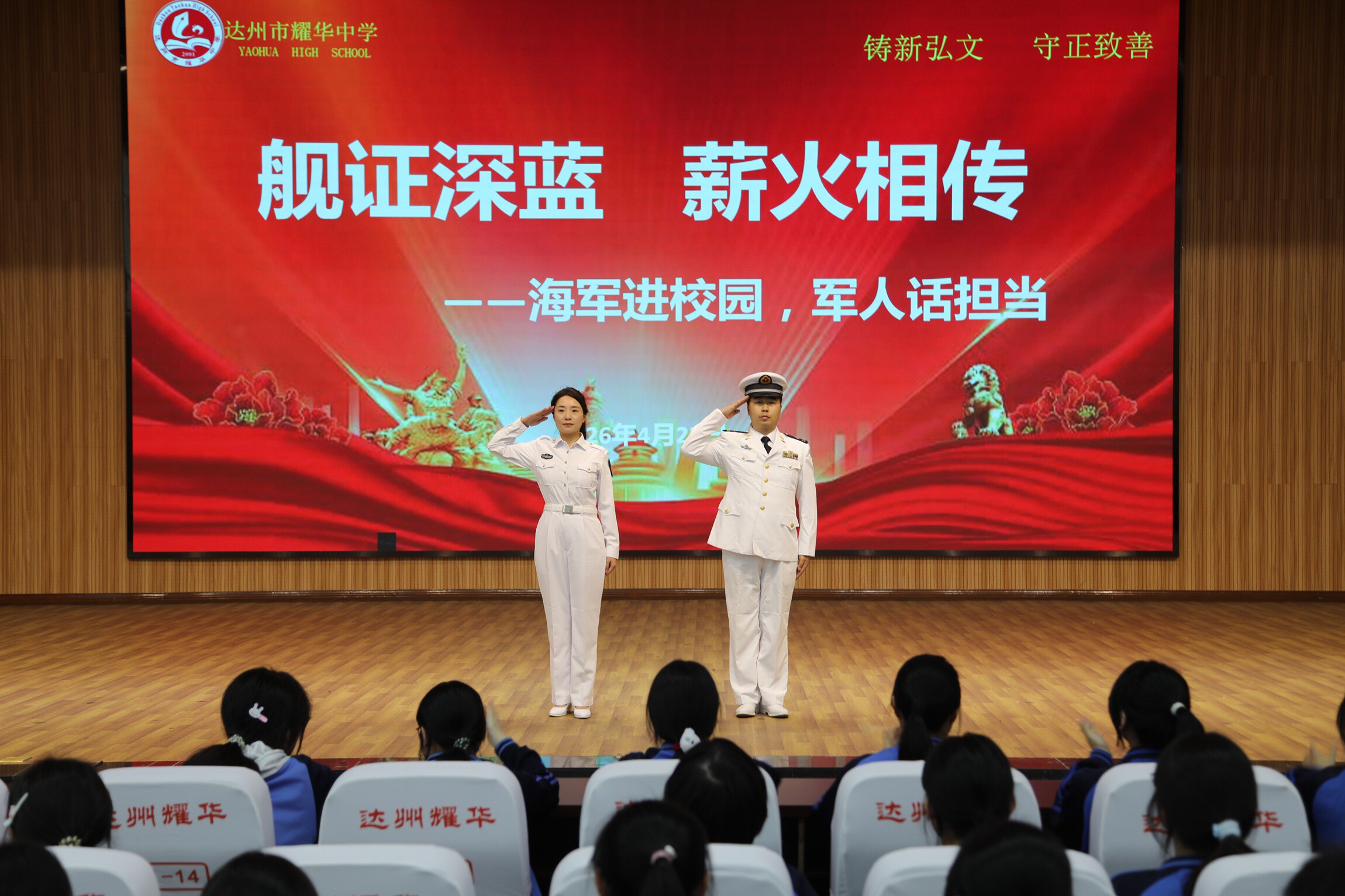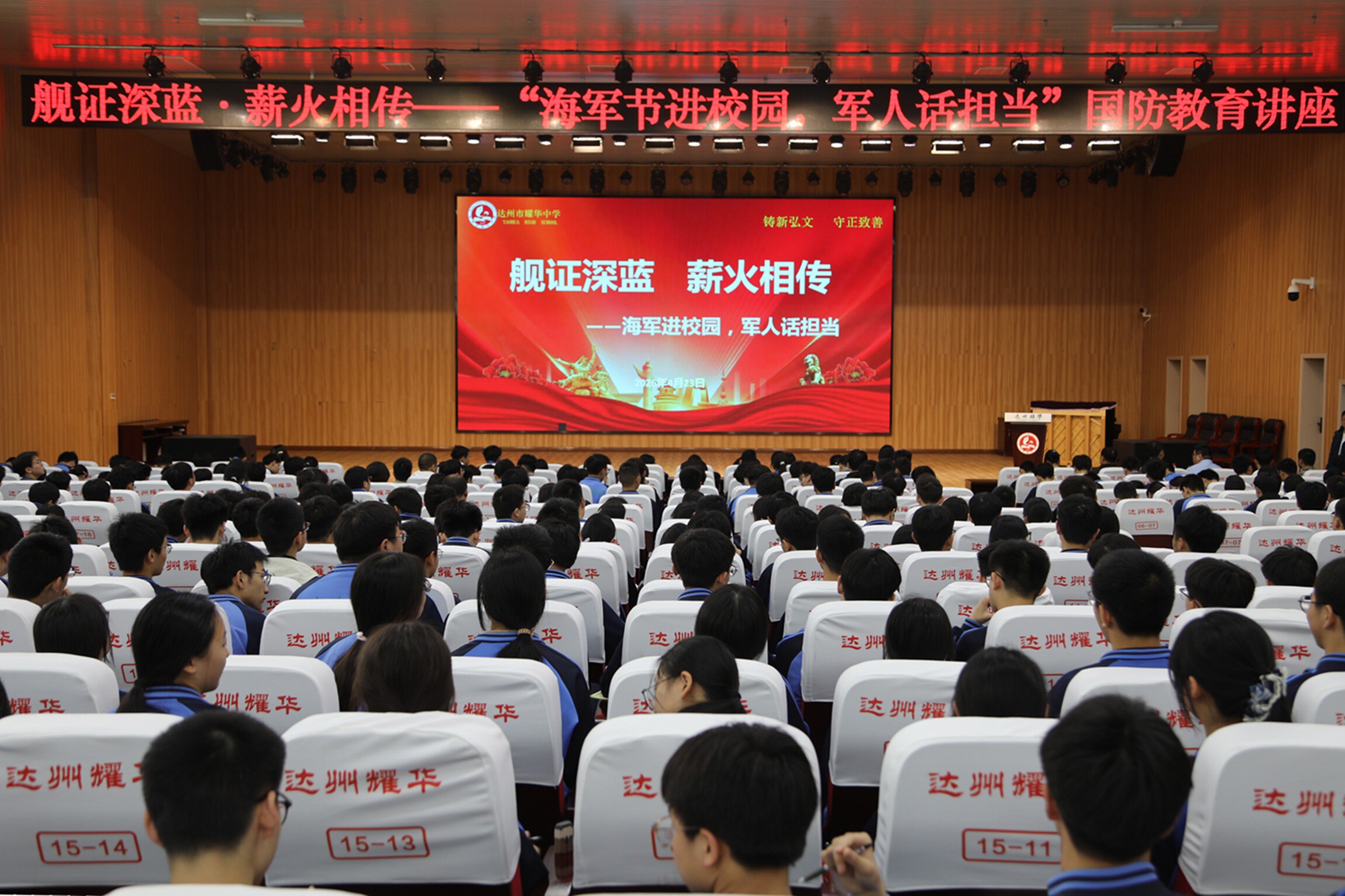 为庆祝中国人民解放军海军成立77周年,厚植青少年国防情怀,传承红色基因,4月23日,达川区退役军人事务局联合区委宣传部、人武部、共青团区委、区教育局、区税务局等相关单位,走进四川省达州耀华中学,开展“舰证深蓝薪火相传——海军进校园,老兵话担当”主题宣讲活动,900余名师生现场聆听宣讲,共赴一场与深蓝海军的“心灵之约”。