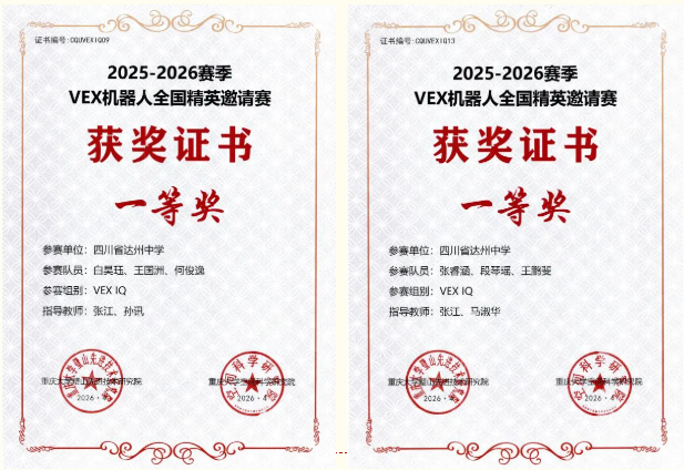 受主办方邀请,四川省达州中学派出两支队伍参赛,均有所斩获:达州中学1队(队号:73967A)和2队(队号:73967B)荣获VEX IQ赛项一等奖;达州中学1队亦获得了“设计奖(Design Award)”!