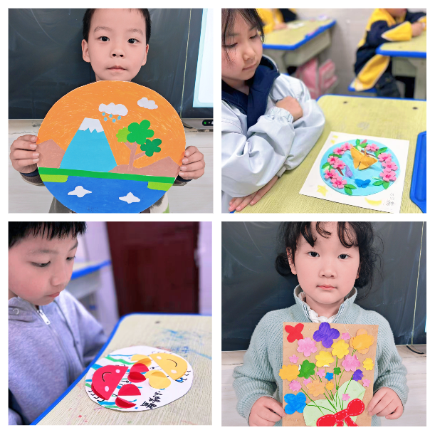 低段的小朋友们化身“创意小画家”,脸上挂着期待的笑容,开启了一场别开生面的贴纸装饰画创作之旅。课堂上,孩子们迫不及待地拿出彩笔和贴纸,小脸上满是认真,小手握着彩笔轻轻勾勒简单轮廓,再小心翼翼地挑选心仪的贴纸,一笔一划、一贴一粘,将春日的烂漫与心底的童趣,悄悄定格在洁白的画纸上。灵动的小动物、唯美的春日风景、可爱的卡通形象,每一幅作品都藏着孩子们的奇思妙想,每一个动作都透着满满的专注与欢喜。