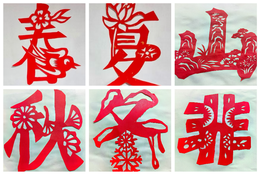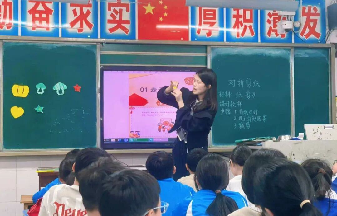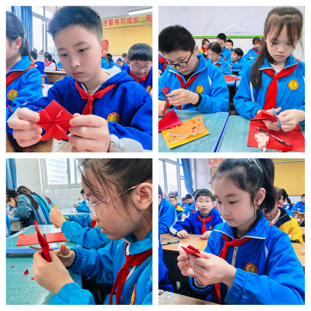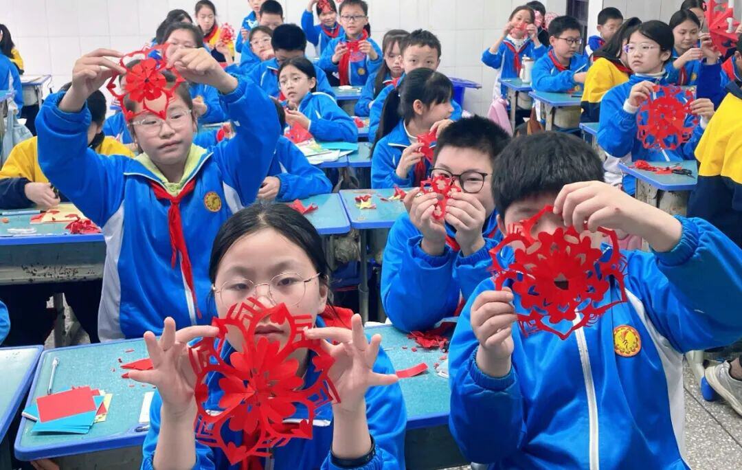 高段的同学们则聚焦传统剪纸技艺,开展了一场匠心独运、乐趣满满的简易剪纸实践活动。课堂上,老师详细讲解了剪纸的基本技巧与构图思路,从握剪刀的姿势到裁剪的力度,耐心指导着每一位同学。孩子们听得格外认真,拿着剪刀反复练习,指尖翻飞间,彩纸簌簌作响,一朵朵精巧的窗花、一个个可爱的爱心、一颗颗寓意美好的五角星,渐渐在手中绽放,每一刀裁剪都透着专注,每一个图案都藏着用心。