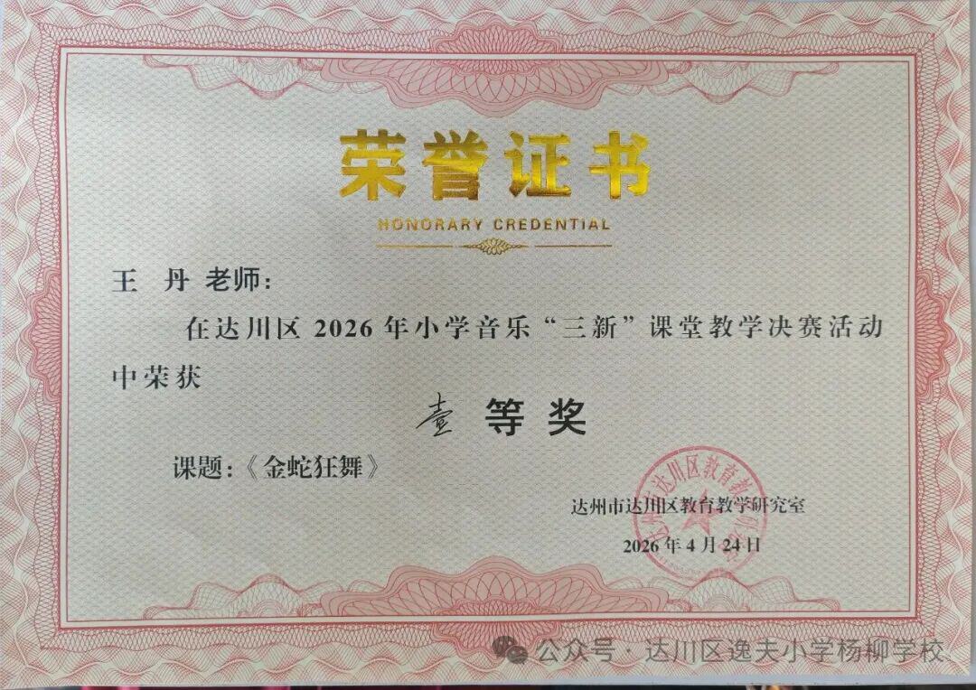这份荣誉,是王丹老师深耕教学、精研美育的成果展现,更是学校音乐教研团队凝心聚力、协同教研的有力见证。一直以来,达川区逸夫小学杨柳学校始终坚持五育并举,全面落实“三新”教育改革要求,深耕美育教学阵地,着力强化教师专业成长,持续推进美育高质量发展,以优质课堂育人,以文化浸润童心,全力培育德智体美劳全面发展的新时代少年。