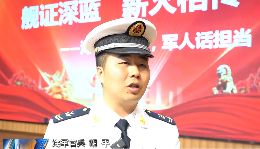 海军官兵 胡平:在人民海军成立77周年这个特殊的日子,能走进校园和同学们分享军旅故事、普及国防知识,我觉得非常有意义。希望通过今天的分享,能让同学们了解海洋国防的重要性,感受到军人的责任与担当,把爱国之情、报国之志融入日常学习生活中,长大后成为有理想、有担当的新时代青年。