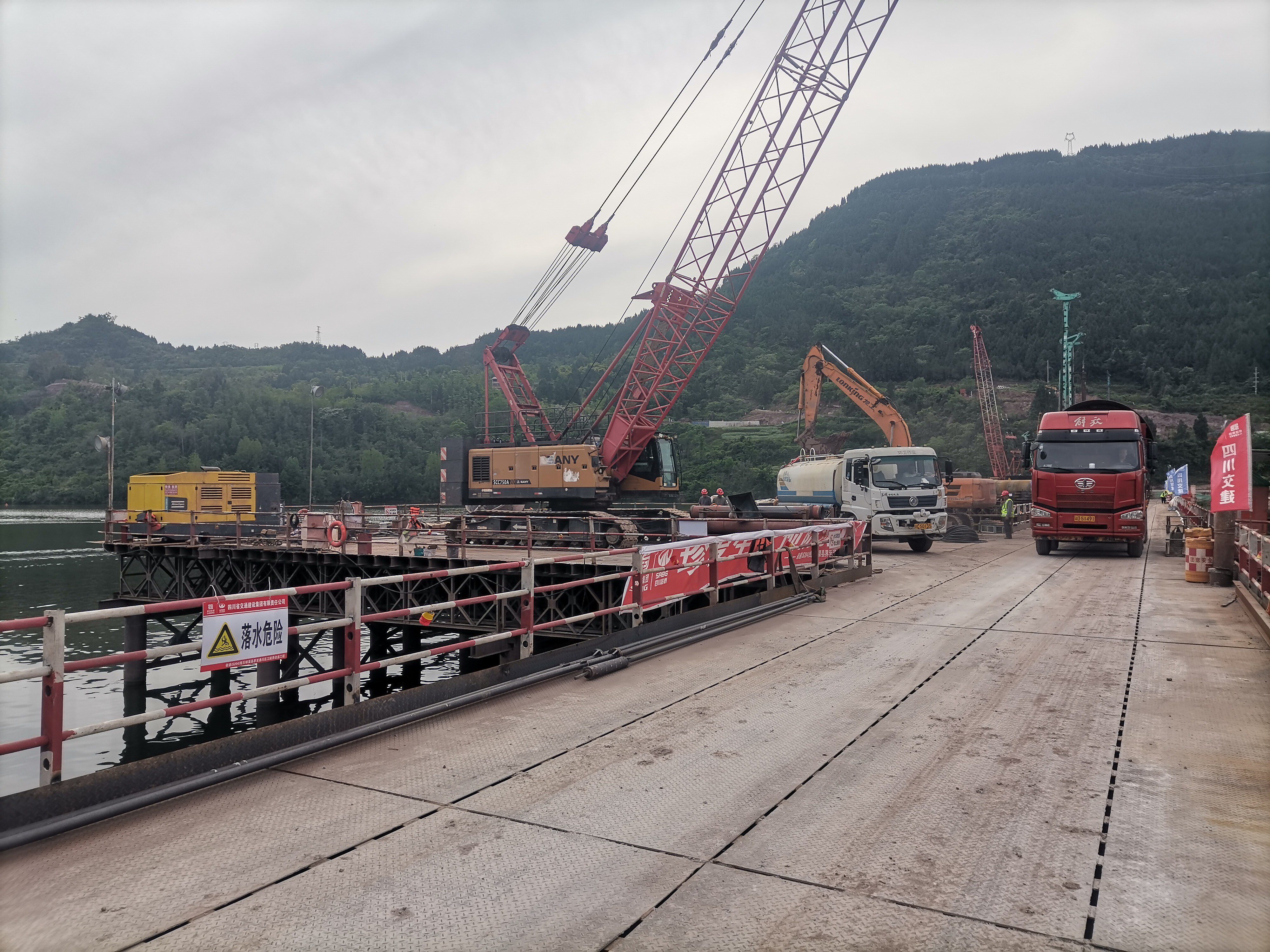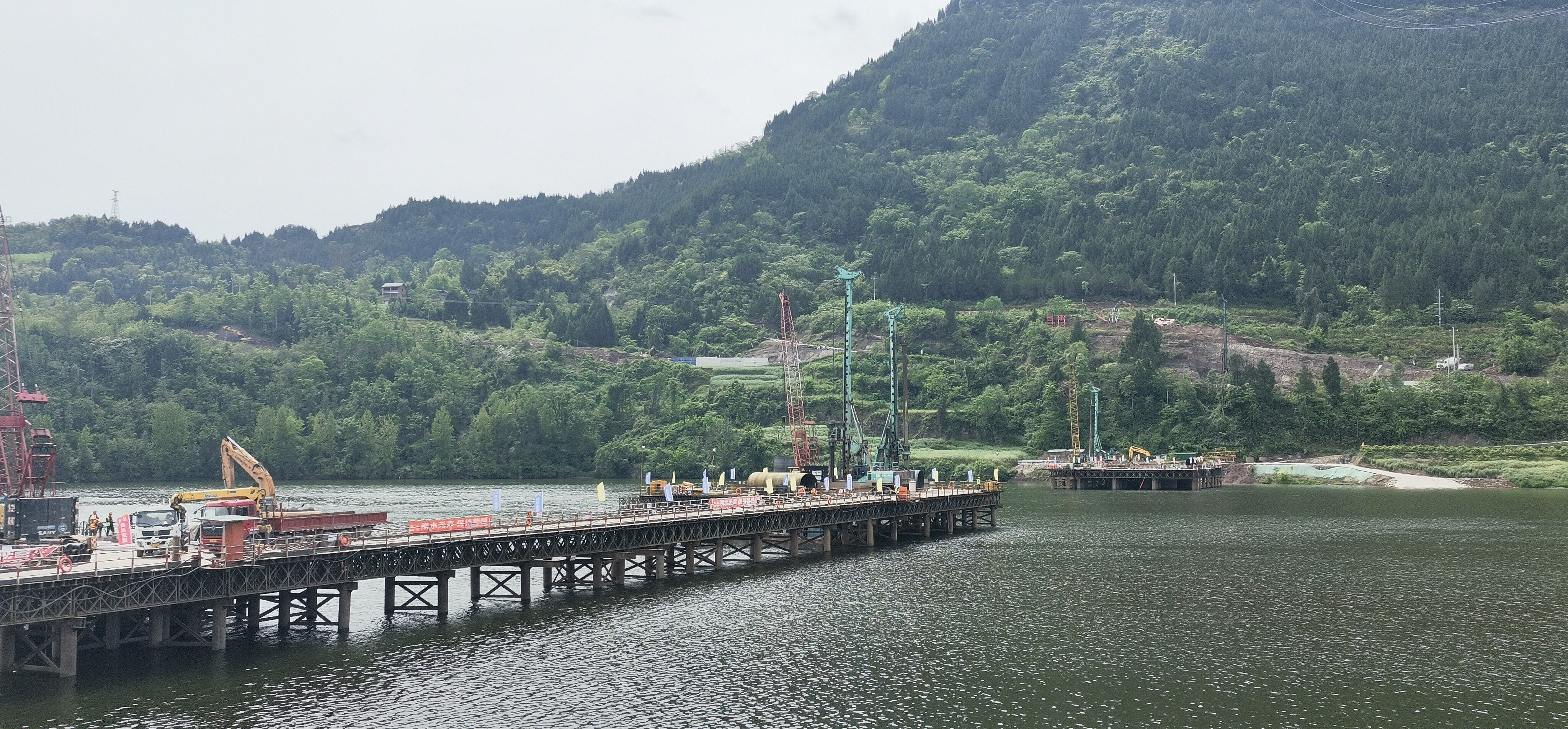 为最大限度降低汛期降雨、河道水位上涨对施工的影响,项目建设单位科学研判水文气象条件,锚定汛前关键工期目标,实行挂图作战、倒排时序、压茬推进。现场全面增配施工力量,共投入作业班组7个、施工人员180余名,实行轮班值守、连续作业,确保工序无缝衔接、施工不停歇。机械投入旋挖钻机5台、各式起重机7台、挖掘机7台、渣土运输车7辆,混凝土拌合站1座,钢筋加工棚1座;各类机械设备协同作业,多个作业面同步施工、交叉推进,全面提升施工效率,全力抢抓水下桩基、路基防护和排水工程基础等关键工序施工,为后续工程建设赢得主动、抢占先机。