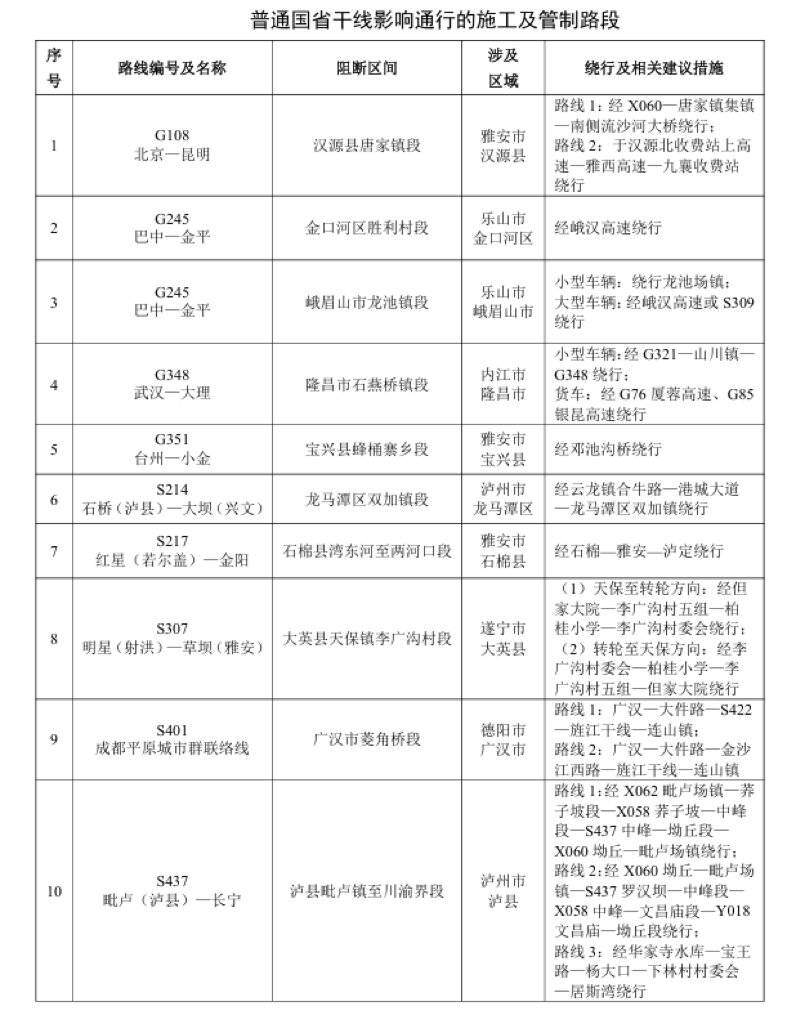 普通国省干线影响通行的施工及管制路段