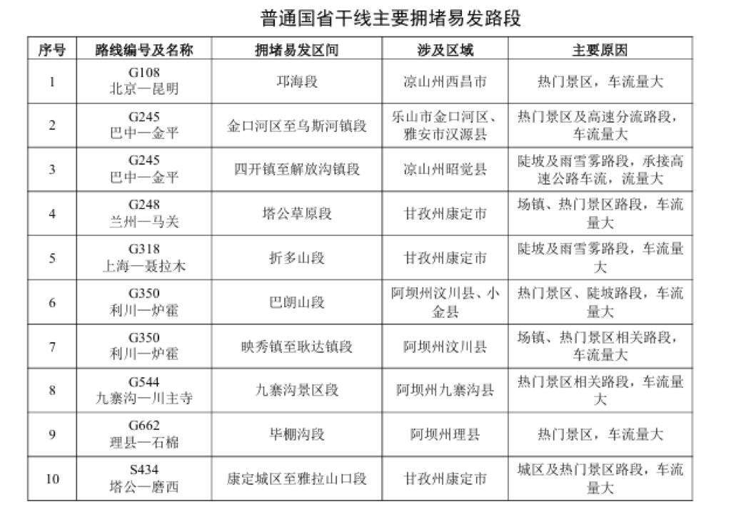 普通国省干线主要拥堵易发路段