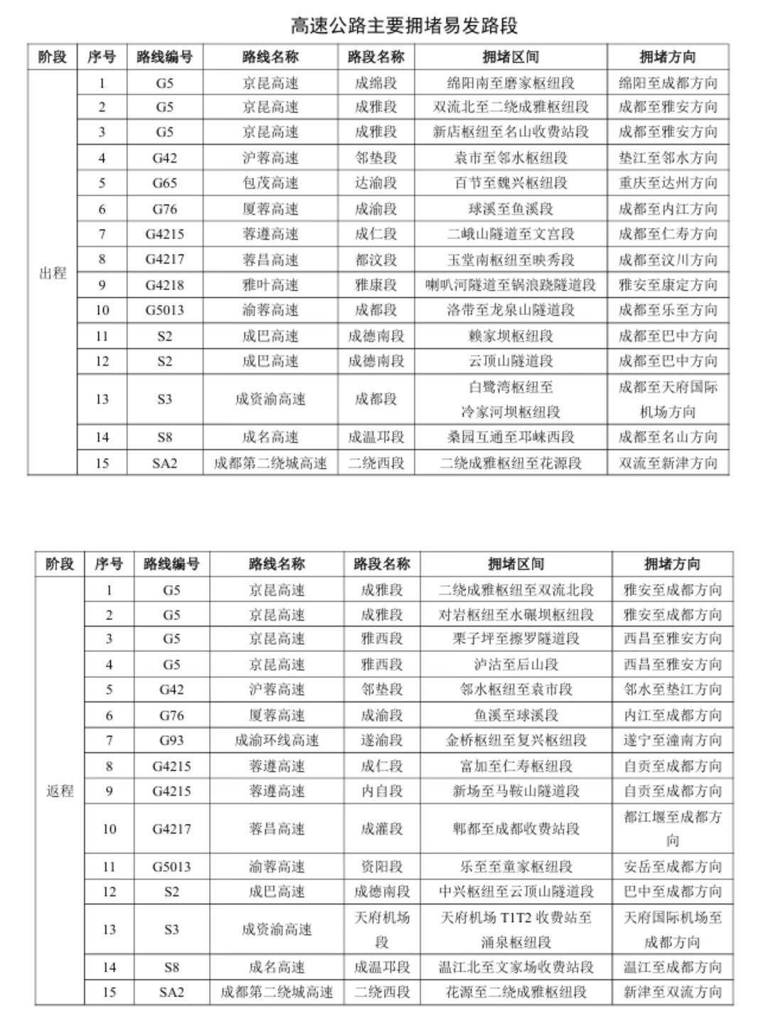 高速公路主要拥堵易发路段