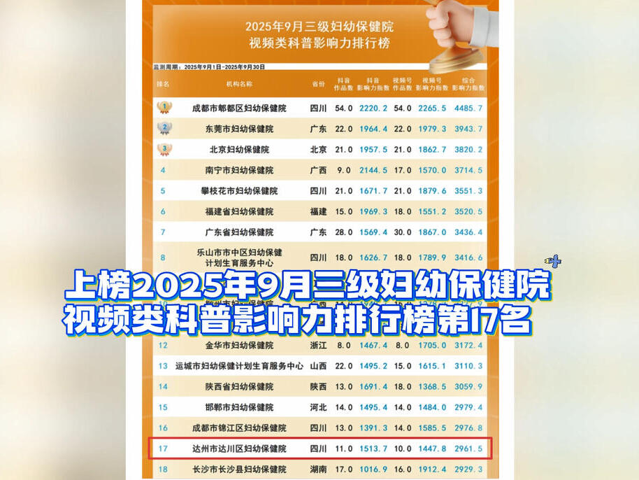 达川区妇幼保健院上榜2025年9月三级妇幼保健院视频类科普影响力排行榜第17名