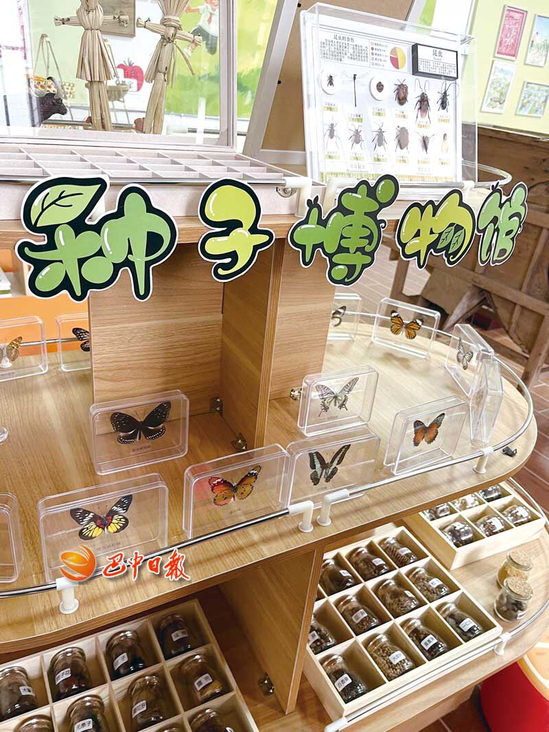 记者看到,“多多农耕园”内,不仅有“农耕博物馆”,还设置有蝴蝶标本展示台、植物标本展示墙等。同学们不仅认识了各种各样的农作物种子,背篓、风车、独轮推车等传统农具,还有来自华中农业大学的老师讲袁隆平的“禾下乘凉梦”——一粒米的故事。学生们一边了解中国古老的农耕文明,一边通过自然科普书籍和绘本,了解不同世界的人们对自然的探索、对农耕的思考、对田园的眷恋,让“田园”与“农业”的意义变得愈加饱满。