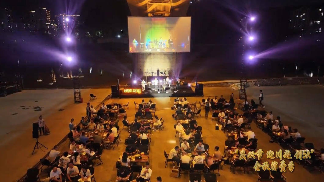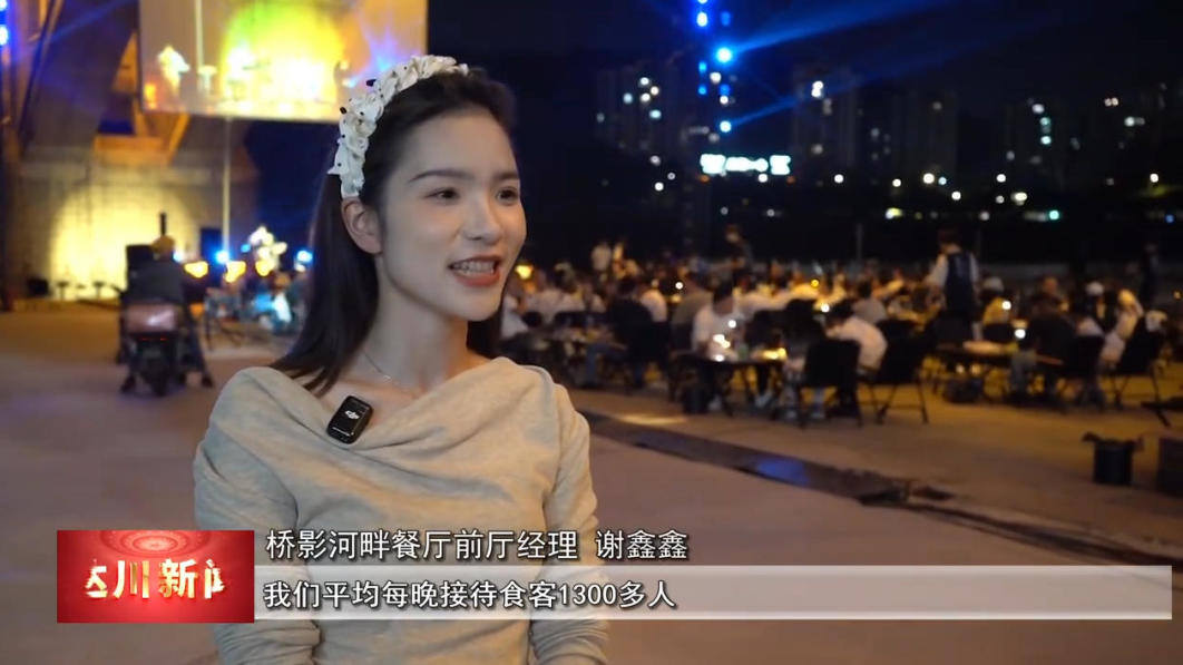 如果说商圈餐饮是双节消费的 “主力军”,那么特色夜经济街区则成为达川消费的 “新亮点”。夜幕降临后,位于达川区岛尖公园的桥影河畔露天餐厅变身“网红”打卡点。晚风轻拂江面,乐队的现场演出激情四射,烤肉香气四处弥漫,桥身投影与河面波光交相辉映,构成独特的“美食+夜景+音乐”沉浸式场景。