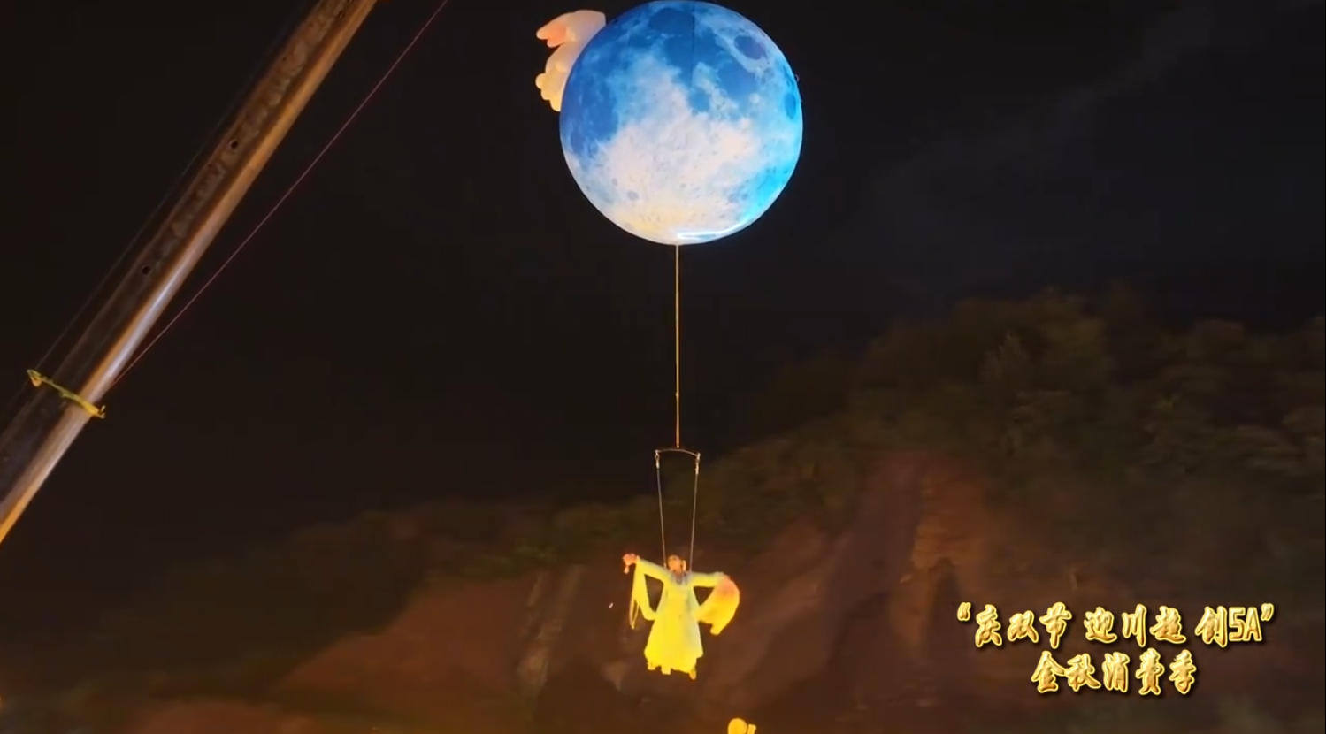 当悠扬的古乐响起,身着飘逸汉服的舞者借助高空威亚缓缓升空,特技表演《嫦娥奔月》正式上演。“嫦娥”在离地数米的空中舒展旋转、轻盈翻飞,月光与灯光交相辉映,将神话场景生动再现,观众掌声与惊叹声此起彼伏。