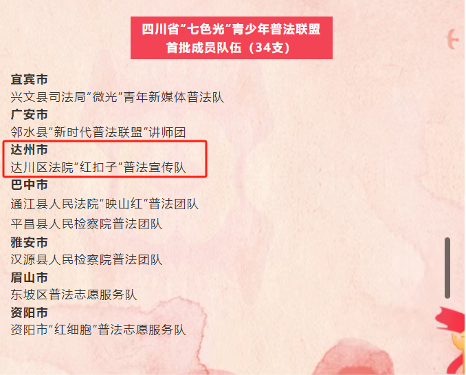 达川区人民法院“红扣子”普法宣传队始终坚持以习近平法治思想为根本遵循,以“扣好人生第一粒法治扣子”为使命,将普法深度融入审判执行工作,探索出从“部门独奏”到“社会合唱”的普法新路径。2024年,“红扣子”被写入省人民法院年度工作报告,获评全省人民法院年度工作成绩突出集体,在全省人民法院第一次少年审判工作会上作经验交流。