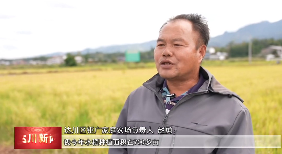 达川区钜广家庭农场负责人 赵勇:我今年水稻种植面积在700多亩,前面中稻亩产在750公斤左右,产值120余万元。今年再生稻面积400多亩,产量比去年高,所以总的水稻产值在150余万元,收入还是很可观的。