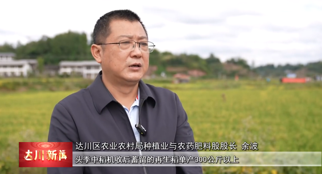 达川区农业农村局种植业与农药肥料股股长 余波:经市级组织专家实测,头季中稻机收后蓄留的再生稻单产300公斤以上,实现再生稻增收近2万余吨,全年稻谷总产达25万余吨,让‘天府粮仓’的招牌更亮更实,为达州市粮食生产 “十三连增” 贡献达川力量。