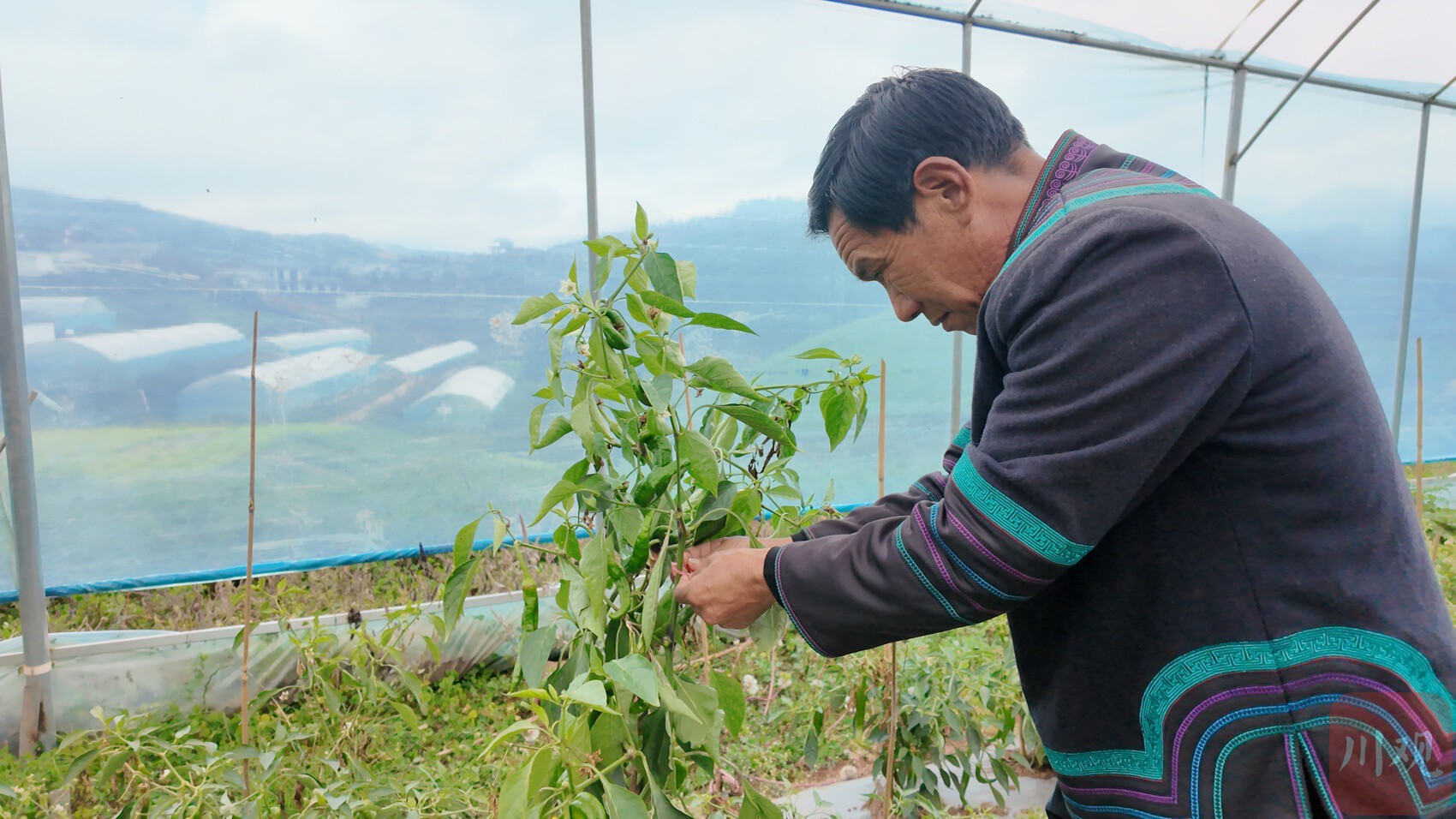 吉勒次子正在查看大棚里的蔬菜。