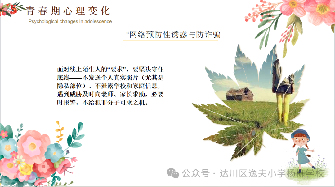 在网络时代,“网络预防性诱惑与防诈骗”成为青春期安全教育的重要一环。通过真实的案例课程提醒大家:面对线上陌生人的“要求”,要坚决守住底线——不发送个人真实照片(尤其是隐私部位)、不泄露学校和家庭信息,遇到威胁及时向老师、家长求助,必要时报警,不给犯罪分子可乘之机。